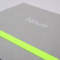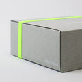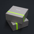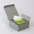 革小物や小物にピッタリなギフトボックス。マットで少しざらついた質感のグレーのギフトボックスに蛍光イエローのゴムをセットしました。ステッカーなどで封はしておりませんので、カードなどをご自身で入れていただくことも可能です。