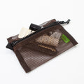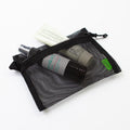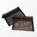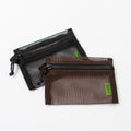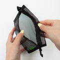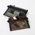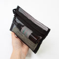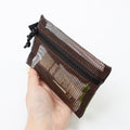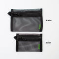 平らなフォルムで、ポケットはないシンプルなデザイン。ファスナーはボディのトップではなく、正面に位置しているところや、メッシュの隙間からさり気なく見えるネオンカラーのブランドタグなどがデザインのアクセントになっています。外からも中身を確認できるため、整理収納にも活躍するアイテム。耐久性があり、劣化しにくいPVC素材のメッシュで、日常はもちろん、アウトドアなど、シーンを問わず使えます。水濡れに強く、通気性がよいのも特徴です。小ぶりなSサイズは、リップクリームや目薬などのコスメや雑貨の持ち運び、小銭やカードを入れた財布としてもおすすめです。
