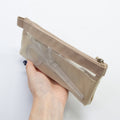 大人気のメッシュシリーズにペンケースサイズが新登場!見せたいものをメッシュ(外側)に、見せたくないものをポケット(内側)に使い分けて収納可能。スリムなので持ち運びもしやすいところがポイント。ペンケース上部にはクリップやヘアピンなどを挟めるテープがあり、自分好みにアレンジ可能です。柔らかいメッシュを使用しているのでカバンの中も傷つけずに収納できます。男女問わずお使いいただけるデザインなのでペアアイテムにも◎