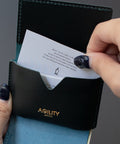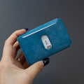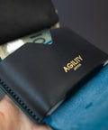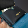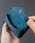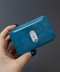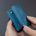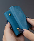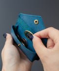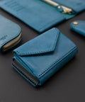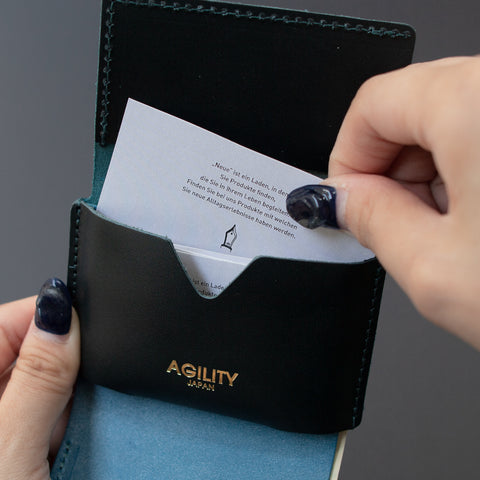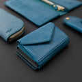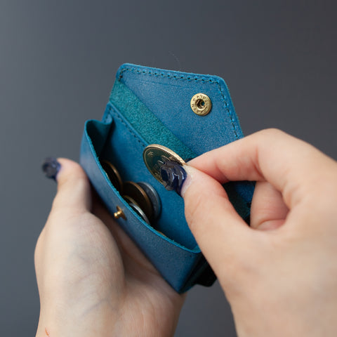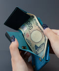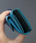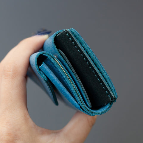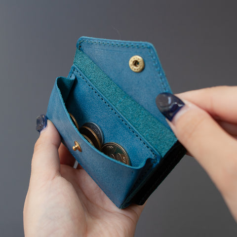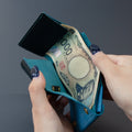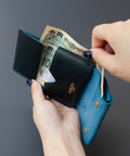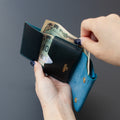 無駄な機能をそぎ落とし極限まで小型に進化したミニマルなお財布。外側のマチ付きフラップポケットは小銭入れになっています。中央にはカードポケットがついており、まとめて6枚までのカードが収納できます。カード入れをめくった裏側のスペースには、まっすぐに伸ばした状態のお札が10枚程度収まります。札の端はカード入れ上部分の革の下にくぐらせて収納します。外側にはもう一ヵ所のカード入れがついており、ICカードなどを入れておくと財布に入れたままタッチができるようになっています。