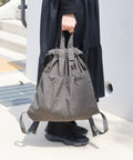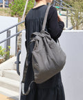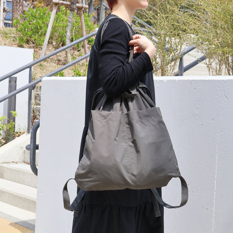 ナップサック、ハンドバッグ、トートバッグの3Wayで使えるナップサック。さらっとした触り心地で軽めの素材感です。定番で合わせやすいブラック、オリーブがかったひとクセあるグレー、コーディネートの差し色になるカーキの3色展開です。カジュアルな印象のナップサックですが、落ち着いた色合いで大人の方におすすめなナップサックに仕上げました。