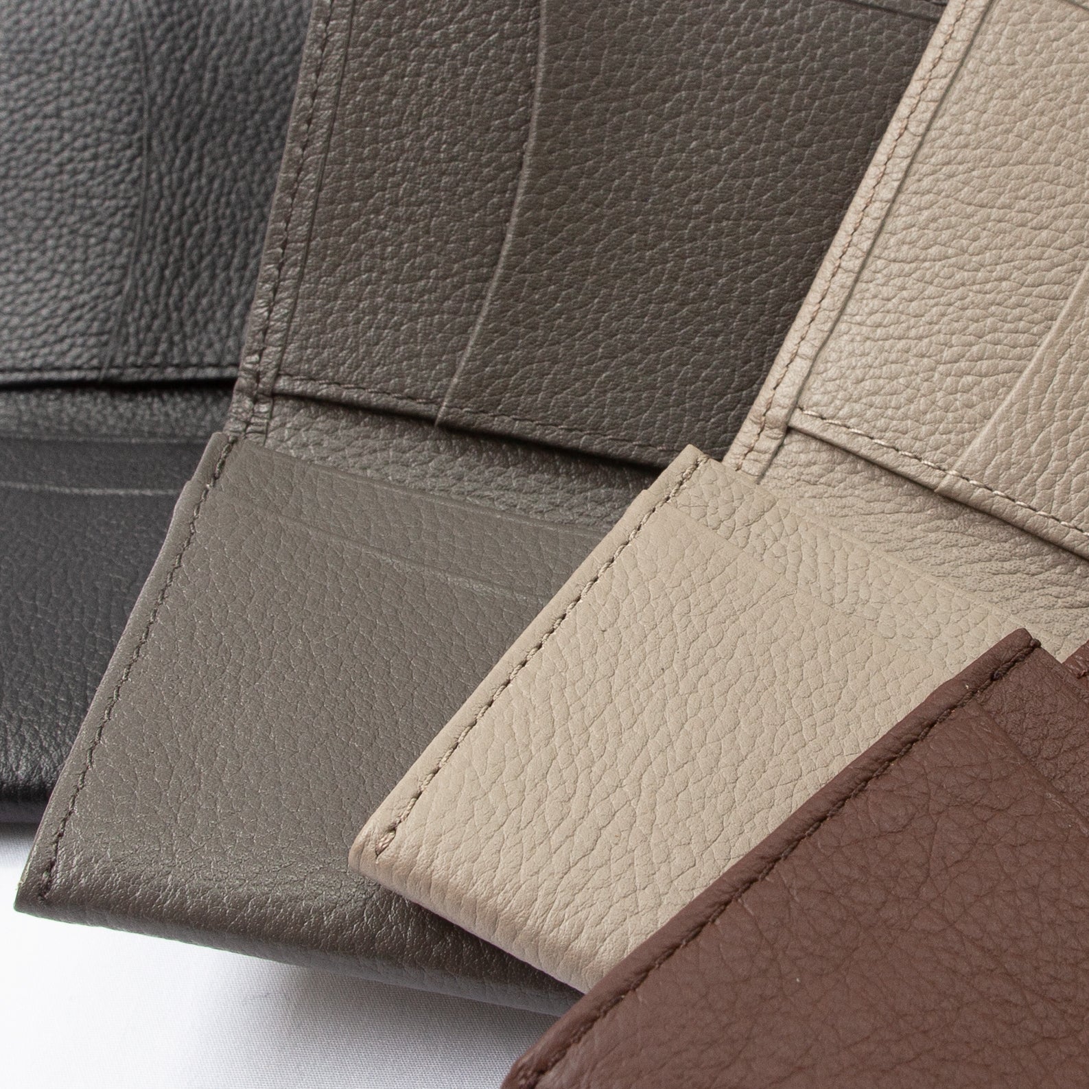 [ OSL / GENUINE LEATHER ]半艶の質感で落ち着いた風合いのソフトレザー。本革ならではの耐久性と柔軟性が特徴です。吟面のシボには個体差があり、世界にひとつだけの表情をたのしめます。汚れや傷が目立ちにくいので毎日使うお財布やカードケースにぴったりな素材です。血筋のトラ(首の関節のシワ)・キズ・黒点などはヌメ革本来の特徴で、一点一点表情が異なり個性があります。