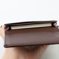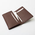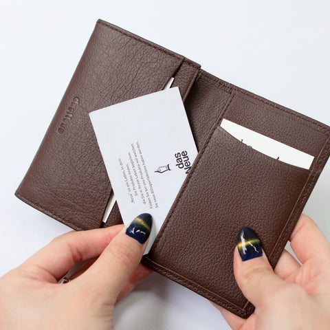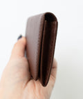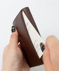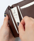 名刺入れとパスケースが一緒になった名刺入れ。ICカードや定期券を入れてタッチにも反応するので、通勤通学にもおすすめ◎メイン収納の他に内側外側合わせて4ヶ所収納スペースがあるので、しっかり分けて収納できます。一般的な名刺入れよりもほんの少し幅にゆとりを持たせたつくりになっているため、名刺の角が折れる心配もありません。マチ部分はササマチタイプでスリムなシルエットでスタイリッシュな印象に。胸ポケットにもかさばらず収納できます。 ※ササマチ•••底にマチがなくサイドのみマチがあるので、底マチと比べコンパクトに折り畳めるのが特徴です。