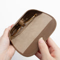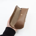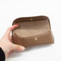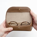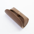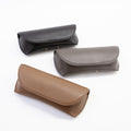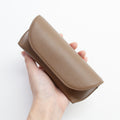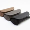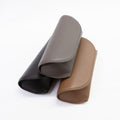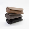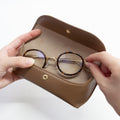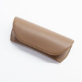 本革の自然なシボ感を大切にして、シンプルでスッキリとしたシルエット仕立てにしました。曲線を活かしたデザインが特徴的でメガネを包み込むように収納できます。メガネのつるを畳んだ形に沿うように、曲面を使った立体製法で仕上げました。愛用のメガネをしっかり保護してくれます。さらに内側にはノーズパッドホルダーが付いていて、左右センターの位置をキープしてメガネをズレにくくします。ホルダーも同じ革を使っているのでパッドの形に合わせてある程度変形してくれます。